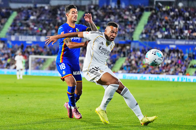 Alex Sancris mengawal Kylian Mbappe semasa perlawanan bola sepak La Liga di Getafe, Sepanyol pada...